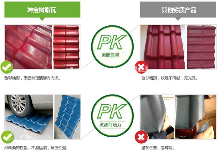 1. 不惜在樹脂瓦的厚度上做文章,廠家通過(guò)把樹脂瓦的厚度做成了2.0mm、2.3mm、2.5mm 2.7mm,這樣看來(lái)原材料是節(jié)省了,價(jià)格甚至可相差10元。也具有競(jìng)爭(zhēng)優(yōu)勢(shì),但是壽命卻大打折扣。