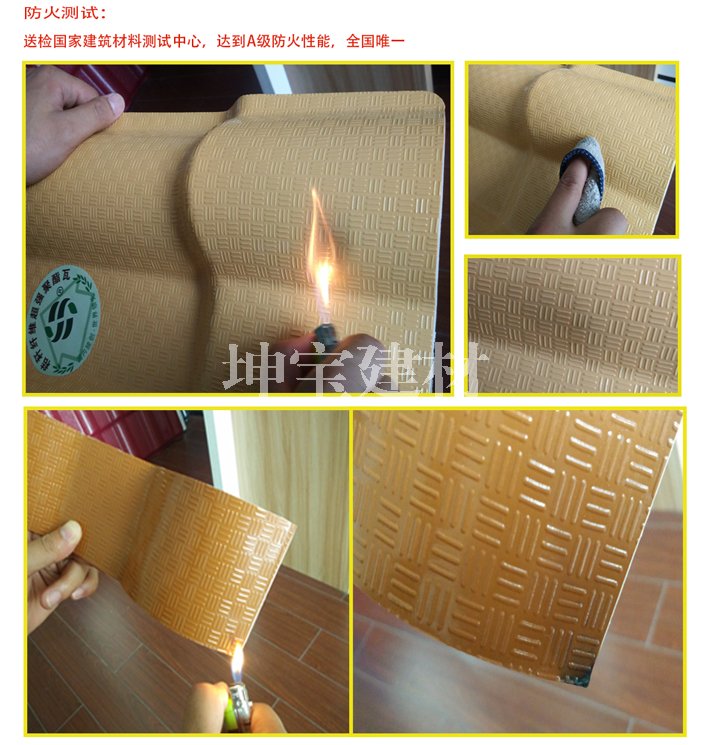 別墅更講安全:離開(kāi)了安全一切都是空談。當(dāng)然作為新型屋面建材,我們當(dāng)然高度重視這一點(diǎn),坤寶秸稈纖維聚酯瓦的防火能力及密度真正的將秸稈纖維系列瓦面的防火能力提高20%-50%,而玻璃纖維絕緣材料并不能對(duì)防火起到絲毫作用。它的導(dǎo)熱系數(shù)非常小,保溫效果好,燃燒性能達(dá)到A1級(jí)防火,不燃性達(dá)B1級(jí),也是全國(guó)唯一達(dá)到A級(jí)防火的聚酯瓦。
