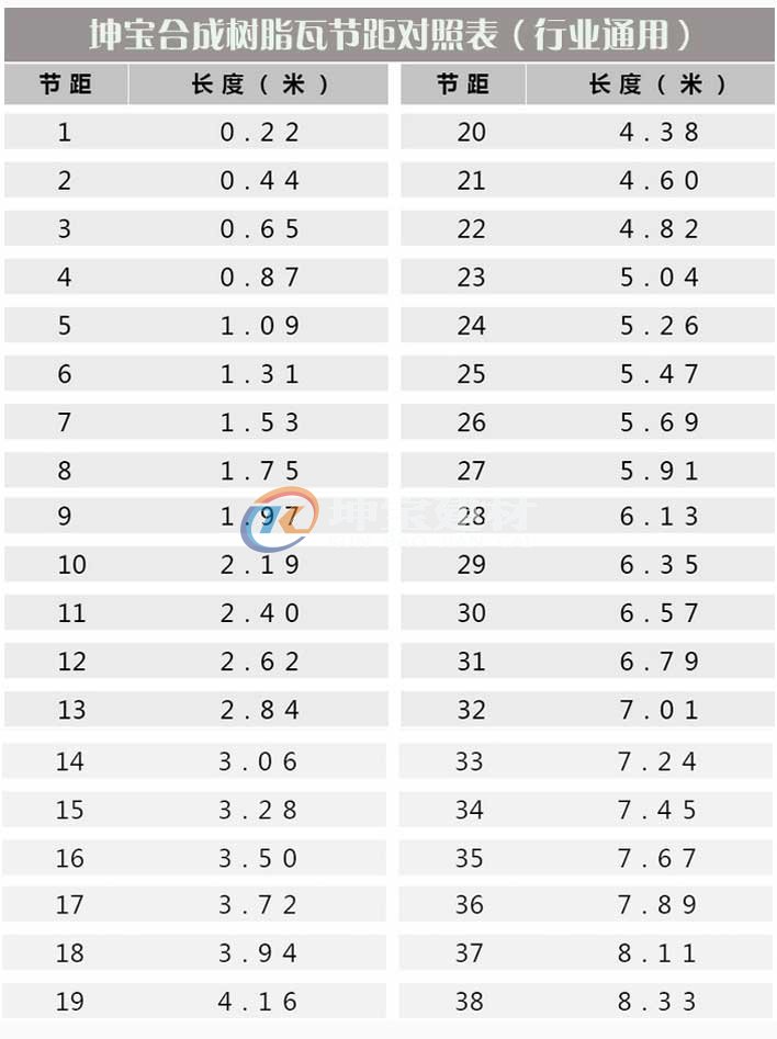 下面是坤寶樹脂瓦節(jié)距表,行業(yè)里面都是通用的哦。
