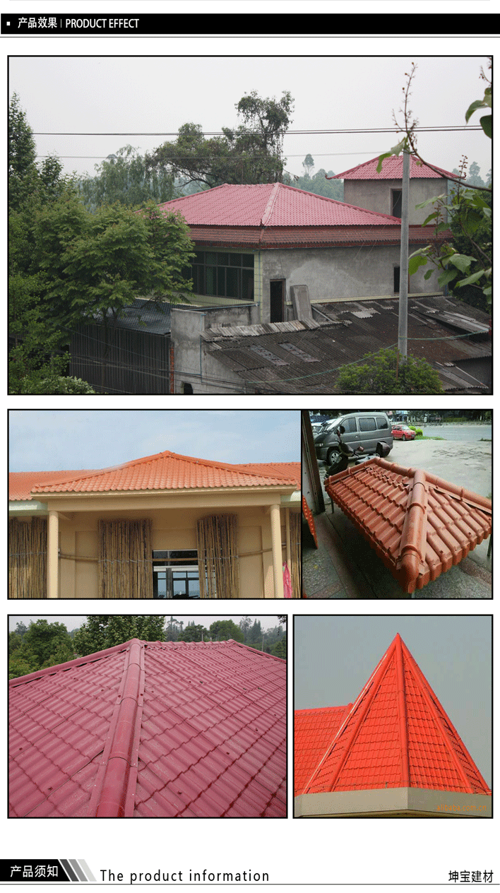 本公司經(jīng)營的合成樹脂瓦、秸稈瓦等產(chǎn)品品種豐富、顏色多樣,可滿足不同客戶的需求,《坤寶牌》合成樹脂瓦具有輕質(zhì),防水,堅韌,保溫隔熱,隔音,抗腐蝕,抗風(fēng)抗震, 抗污,綠色環(huán)保,防火,絕緣,超長壽命,安裝簡便等優(yōu)點,它突出的特點是色彩豐富并長久不褪色,造型美觀立體感強(qiáng)且符合我國建筑文化特色。同時,它還是各類永久建筑屋面裝飾和防火的理想材料,尤其適用于我國目前大力推廣的“城市形象工程改造”和“新農(nóng)村屋面工程”。