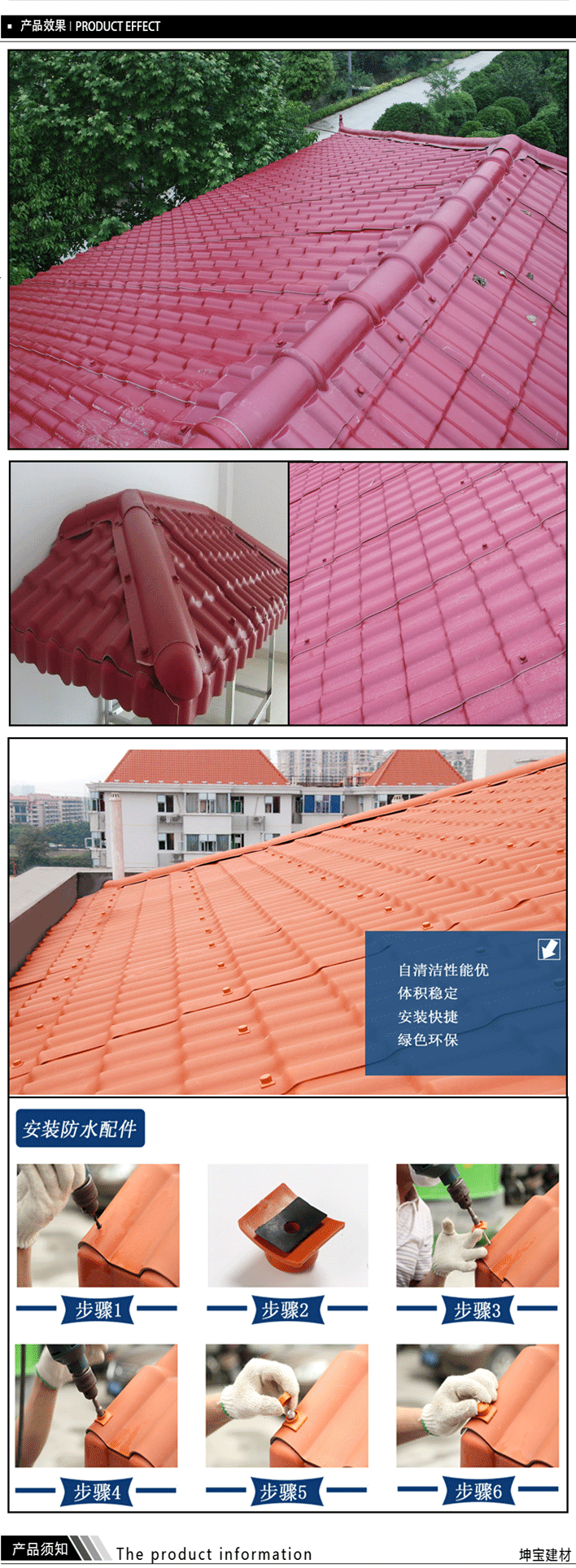 本公司經(jīng)營(yíng)的合成樹(shù)脂瓦、秸稈瓦等產(chǎn)品品種豐富、顏色多樣,可滿足不同客戶的需求,《坤寶牌》合成樹(shù)脂瓦具有輕質(zhì),防水,堅(jiān)韌,保溫隔熱,隔音,抗腐蝕,抗風(fēng)抗震, 抗污,綠色環(huán)保,防火,絕緣,超長(zhǎng)壽命,安裝簡(jiǎn)便等優(yōu)點(diǎn),它突出的特點(diǎn)是色彩豐富并長(zhǎng)久不褪色,造型美觀立體感強(qiáng)且符合我國(guó)建筑文化特色。同時(shí),它還是各類永久建筑屋面裝飾和防火的理想材料,尤其適用于我國(guó)目前大力推廣的“城市形象工程改造”和“新農(nóng)村屋面工程”。