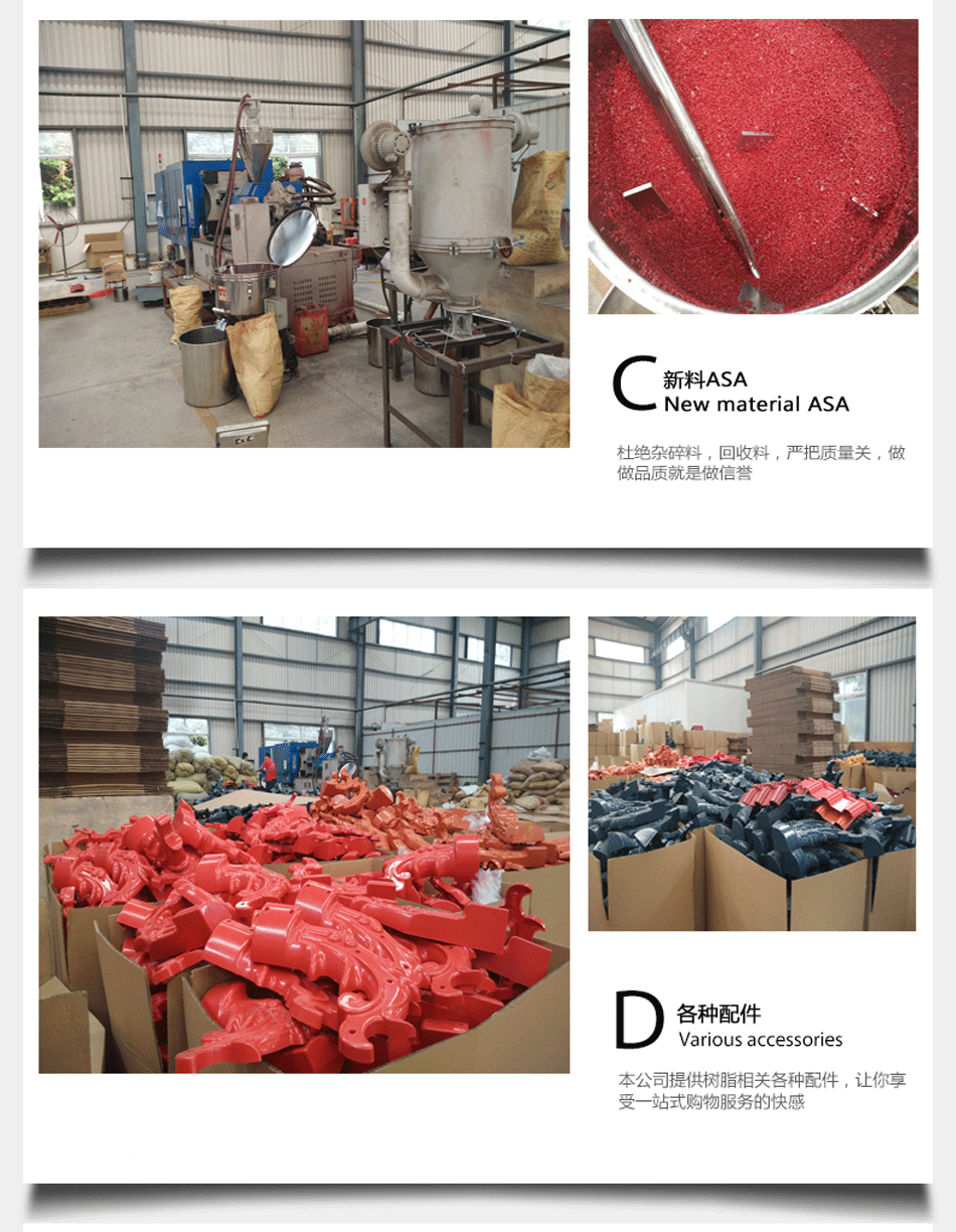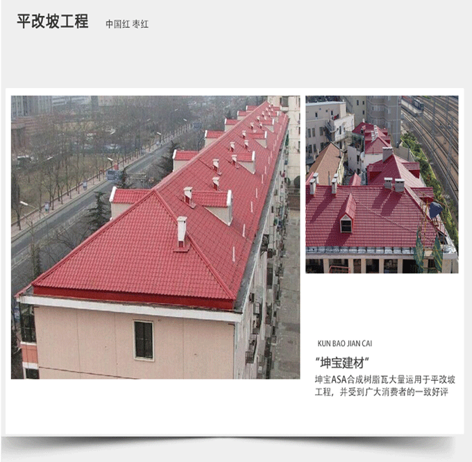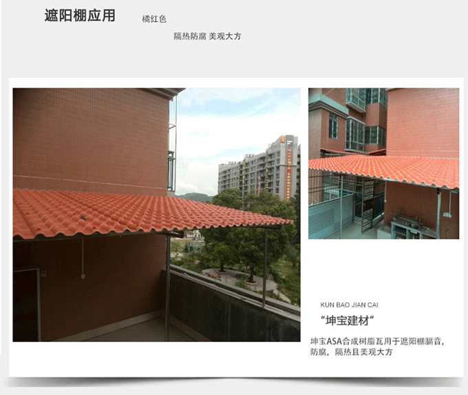 合成樹脂瓦重量及配件品種齊全,因此很容易裝卸;另外,合成樹脂瓦有效寬度為800mm或960mm。瓦鋪裝效更高,更節(jié)省成本。